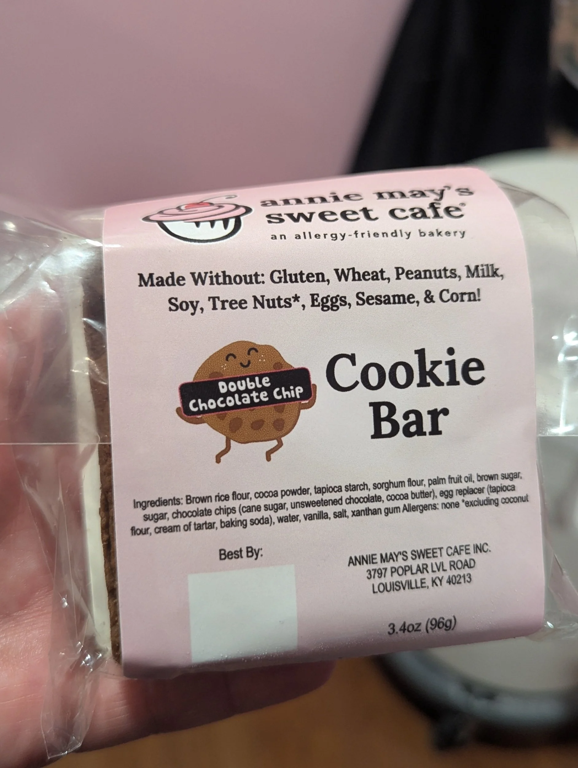 Chocolate chip ingredients: Brown rice flour, tapioca starch, sorghum flour, palm fruit oil, brown sugar, sugar, chocolate chips (cane sugar, unsweetened chocolate, cocoa butter), egg replacer (tapioca flour, cream of tartar, baking soda), water, vanilla, salt, xanthan gum Allergens: none